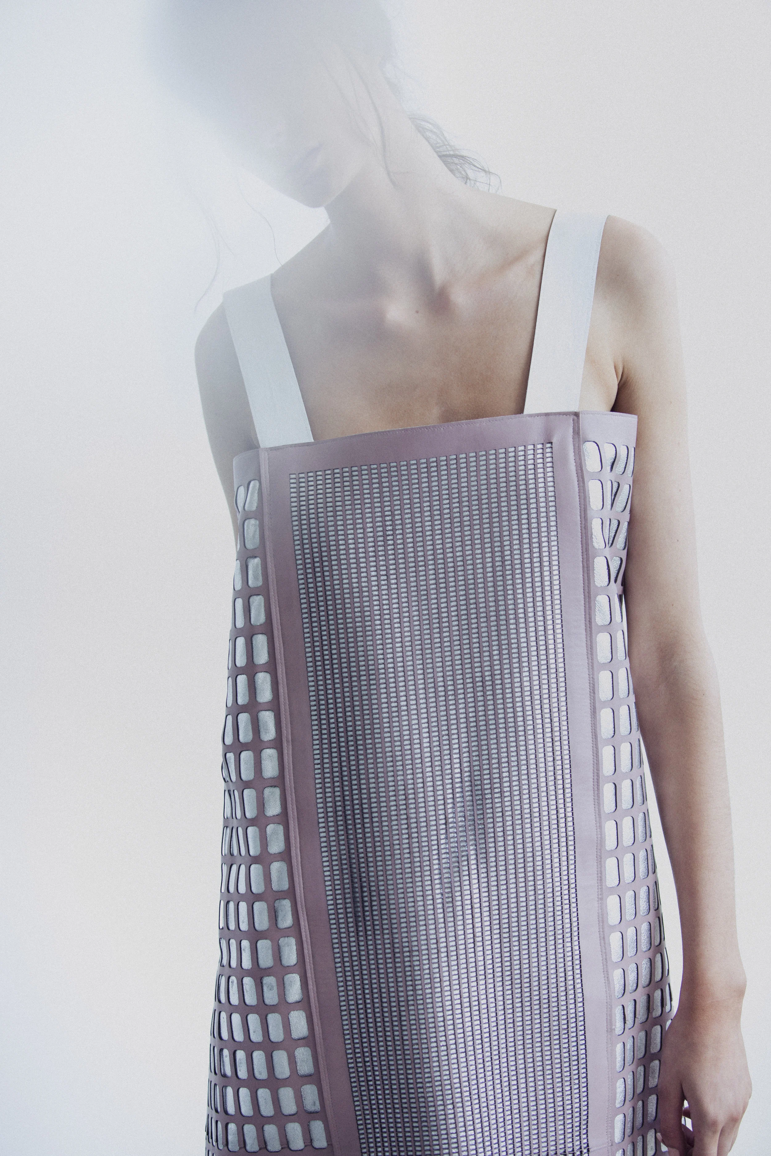 The collection explores the phenomenon of shadow and reflection; the illusion of angles and layers through textural leather pieces and transparent silks. Surface textures take on the illusion of prints, which contradict their three-dimensional nature.